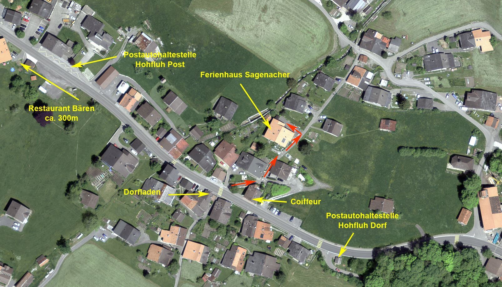 Mit dem Postauto ab Brünig oder Hasliberg Reuti zur Postautohaltestelle Hohfluh-Dorf oder Hohfluh-Post.