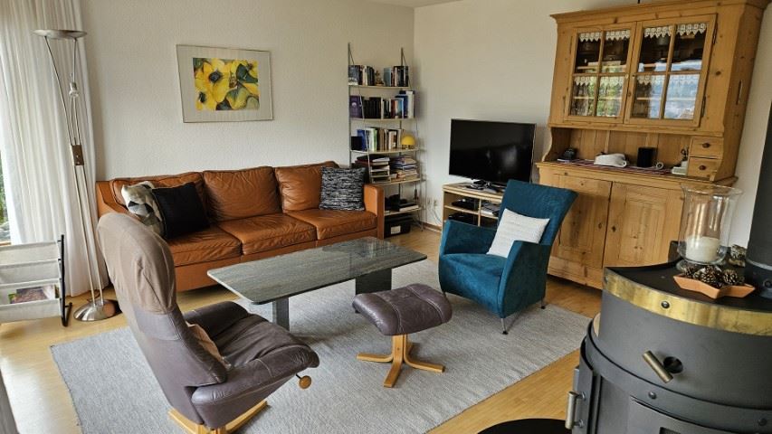 Wohnzimmer - Sofa und 2 Sessel - Schwedenofen - TV und DVD - Bücherecke